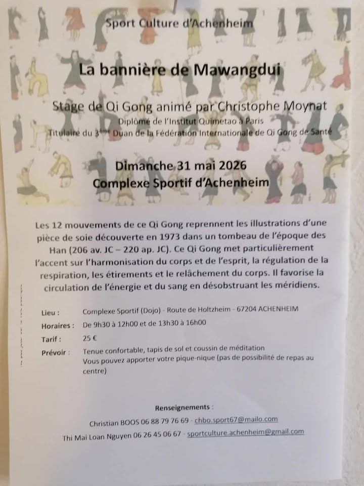 Stage proposé par l’association Sport Culture Achenheim et animé par Christophe Moynat (Diplômé de l’Institut Quimetao à Paris – Titulaire du 3ᵉ Dan de la Fédération Internationale de Qi Gong de Santé)
